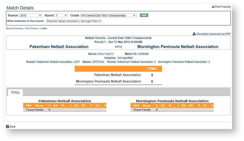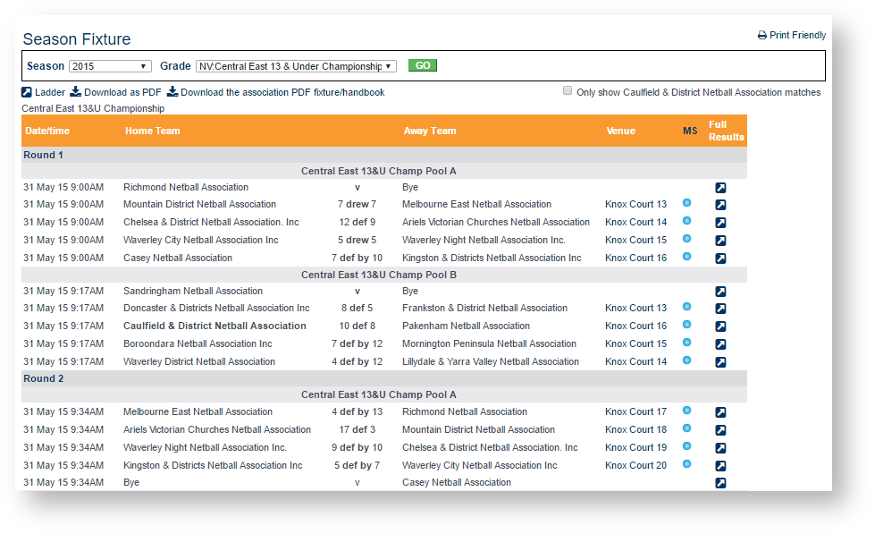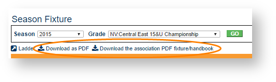 From this screen you can also download the fixture as a PDF or download the association PDF fixture/handbook using the links provided.