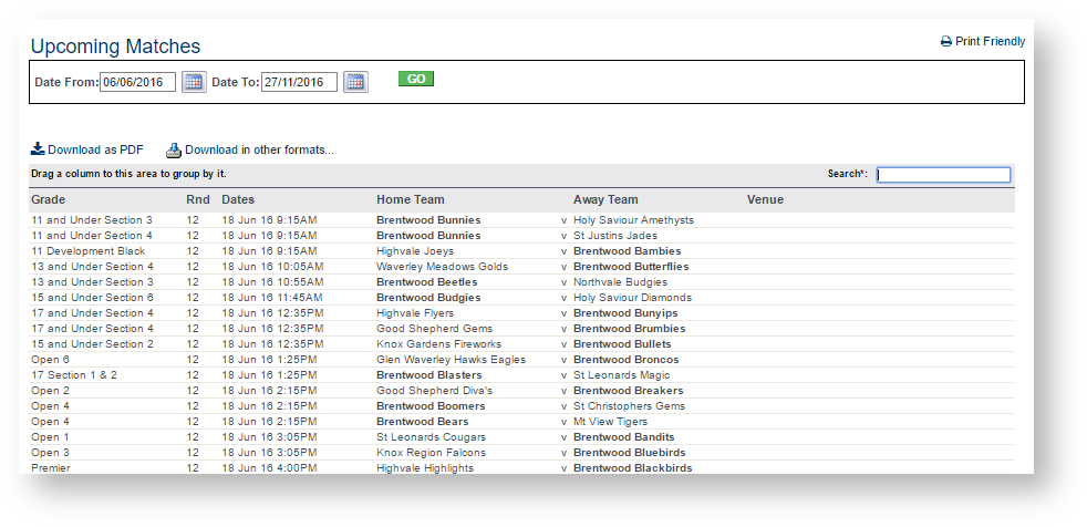 The fixture will be displayed, in date/time sequence and you have the option of filtering out all matches except those for your organisation/club by selecting the Only show...[club name] link.