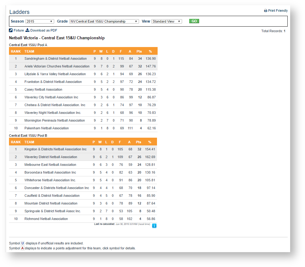 From this screen you can view Match Results, Venue Details and Ladders.