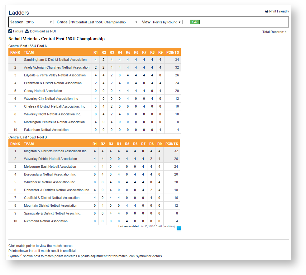 Use the Season and Grade selection listboxes to select the season fixture to display, then click the Go button.